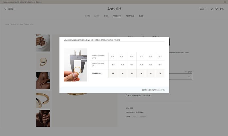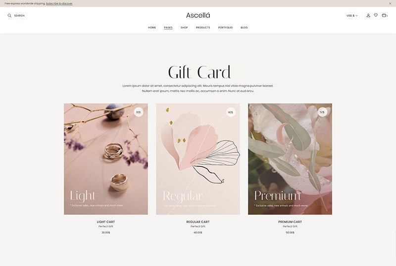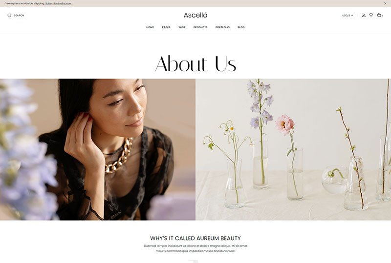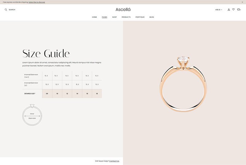 Ascellá provides you with a remarkable selection of inner pages for presenting your business, your clients, displaying size guides, gift cards and more.